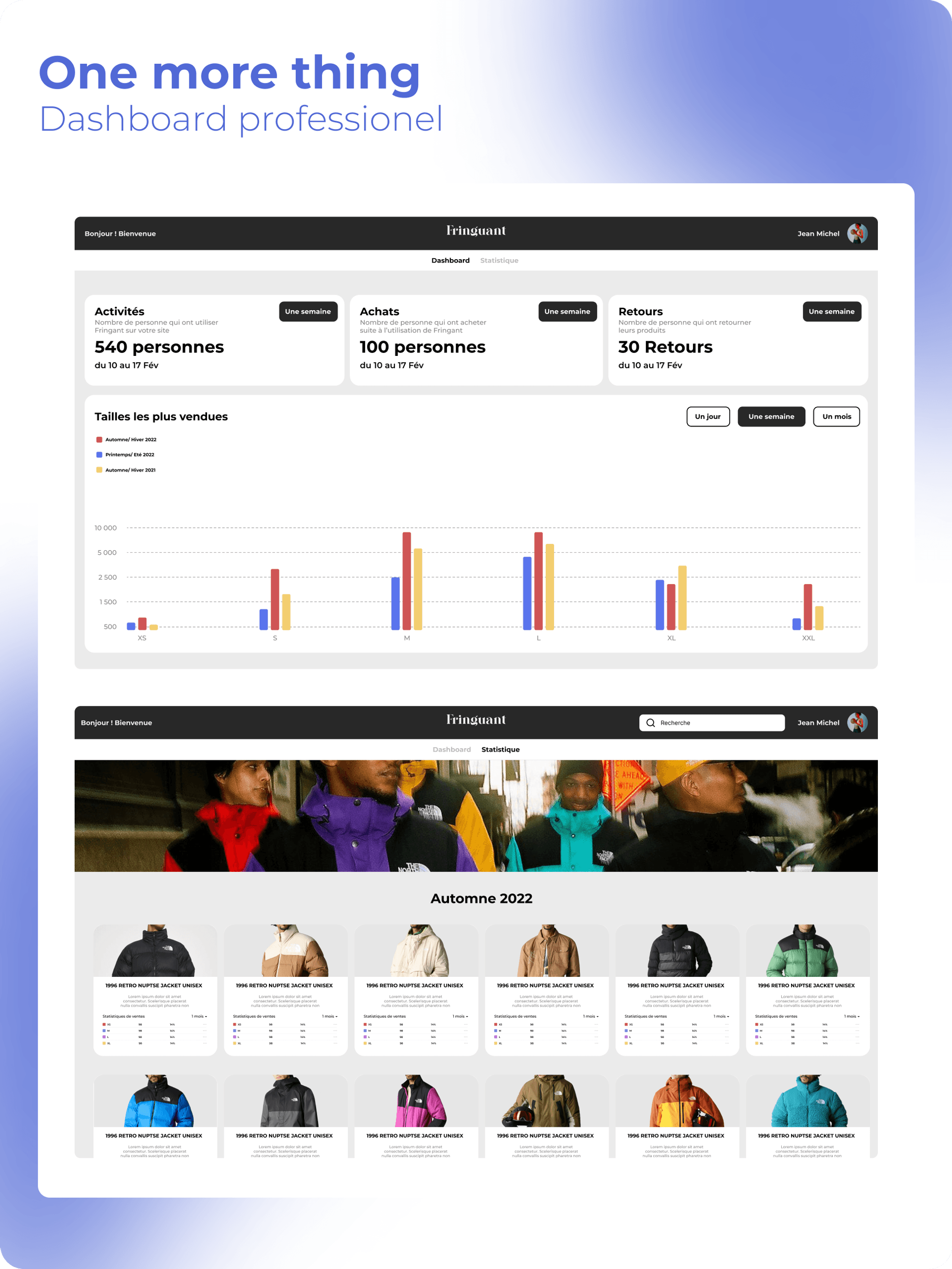 La plateforme utilisateur client propose de garder en mémoire dans une bibliothèque nos tailles pour toutes les marques et tous les types de produits qui sont proposés par ces marques. Dans ce dashboard client nous proposons également à Fringuant de mettre en avant des marques et des produits qui peuvent intéresser l’utilisateur notamment pour trouver des vêtements ressemblant ou se rapprochant de ses habitudes de consommation.