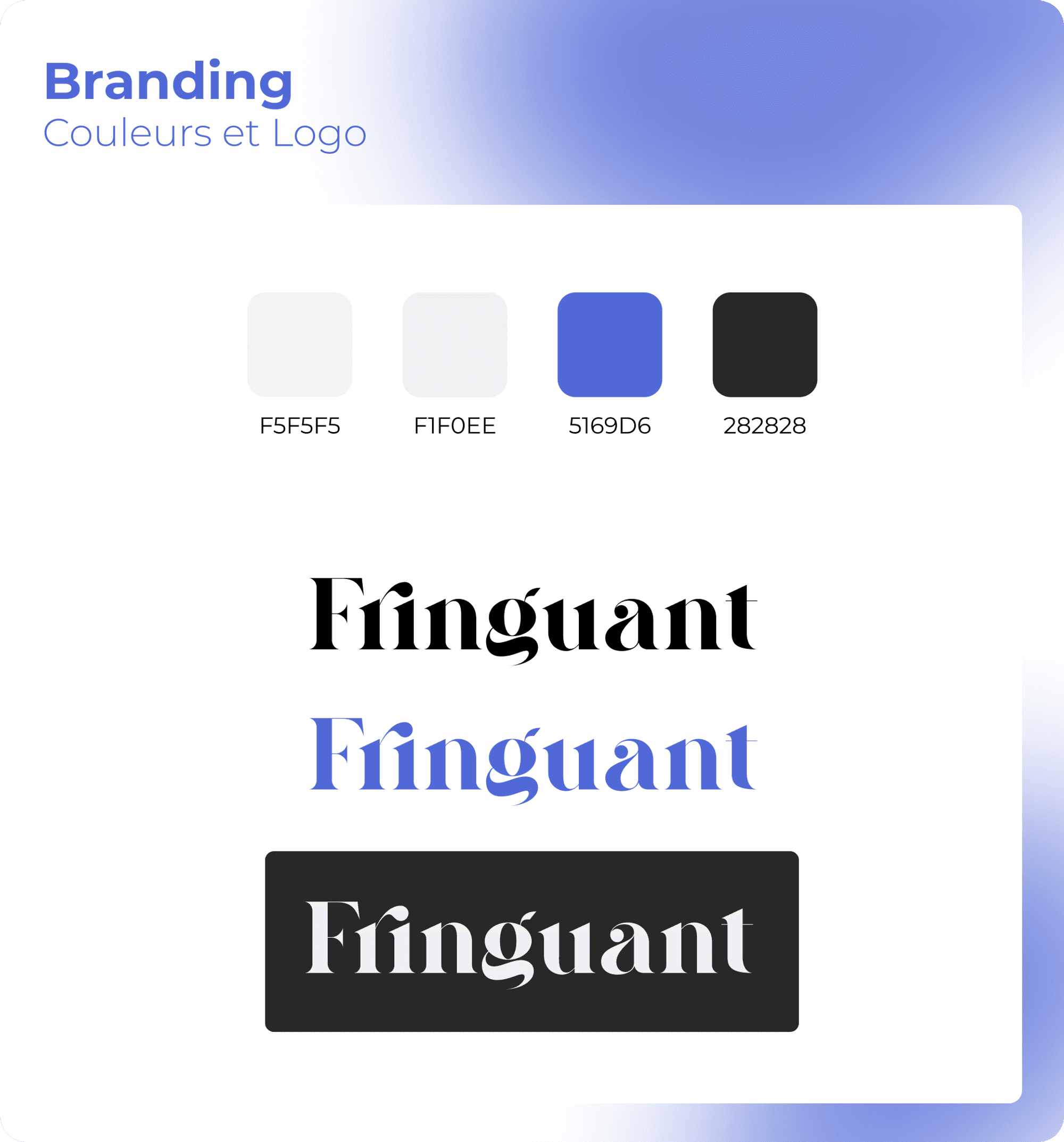 Enfin nous avons sélectionné un bleu pastel. Le but de celui-ci est de rappeler les couleurs d’un outil tech, ce qui est complètement le cas de Fringuant. Celui-ci est légèrement pastel car nous ne souhaitions pas donner à cette identité visuelle un caractère trop présent, Fringuant est une marque blanche et son interface et direction artistique doit pouvoir s’adapter à celles de leurs clients.