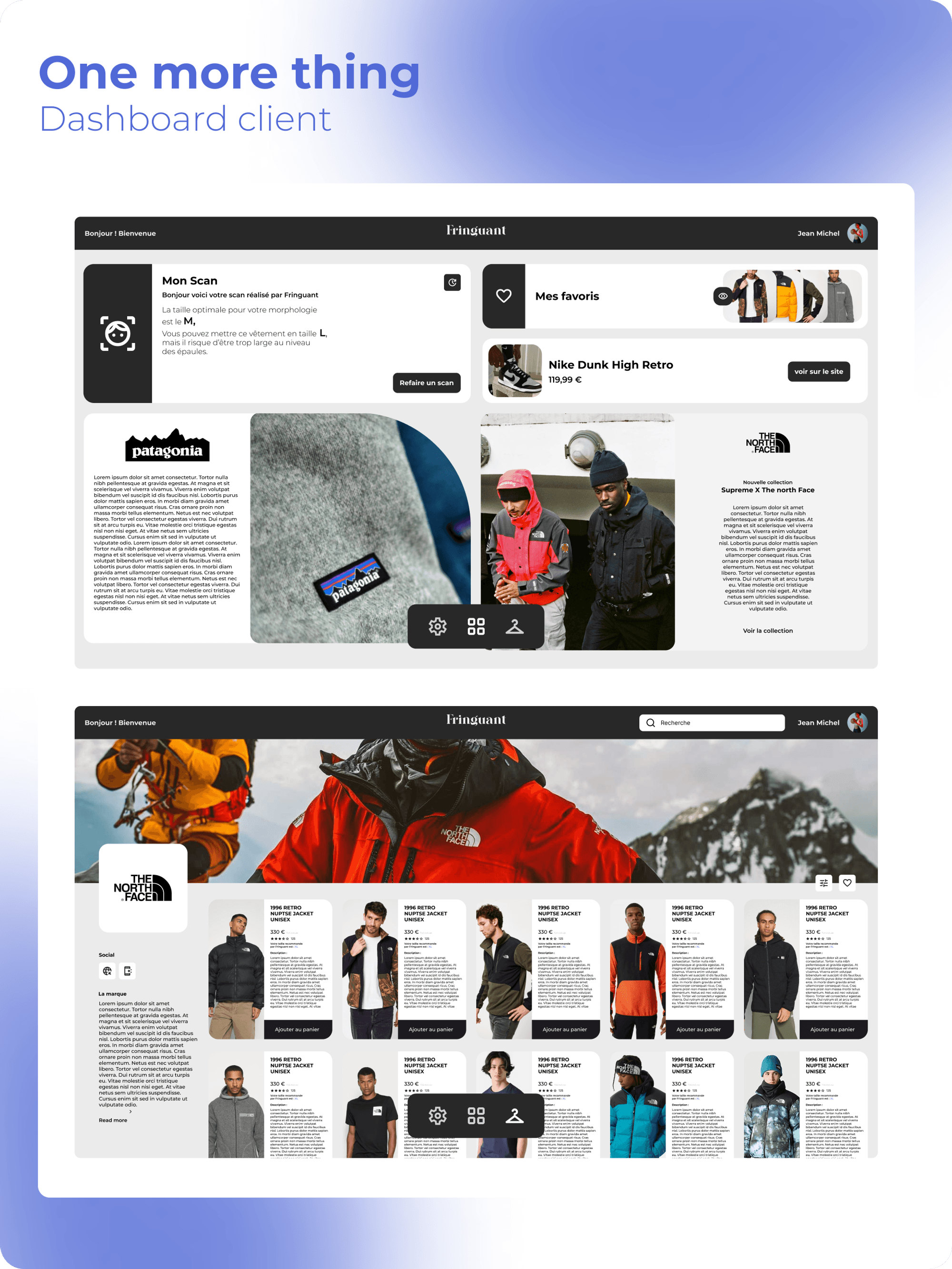 La plateforme utilisateur client propose de garder en mémoire dans une bibliothèque nos tailles pour toutes les marques et tous les types de produits qui sont proposés par ces marques. Dans ce dashboard client nous proposons également à Fringuant de mettre en avant des marques et des produits qui peuvent intéresser l’utilisateur notamment pour trouver des vêtements ressemblant ou se rapprochant de ses habitudes de consommation.