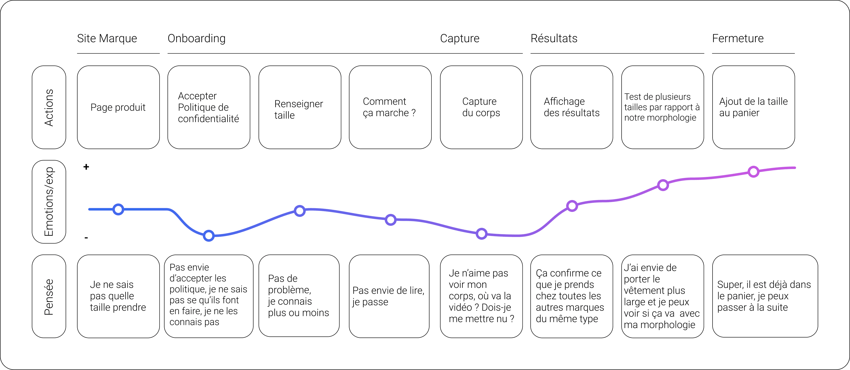 Ici nous pouvons remarquer que les principaux points de frictions sont lors que la demande d'accepter les politiques de confidentialité, lorsque l'on doit comprendre comment marche l'outil Fringuant et lorsque l'on l'utilise. De plus la question du stockage de nos données personnelles est très importante pour cet outil, nous le retrouvons dans les points de friction lors de la capture du coprs.