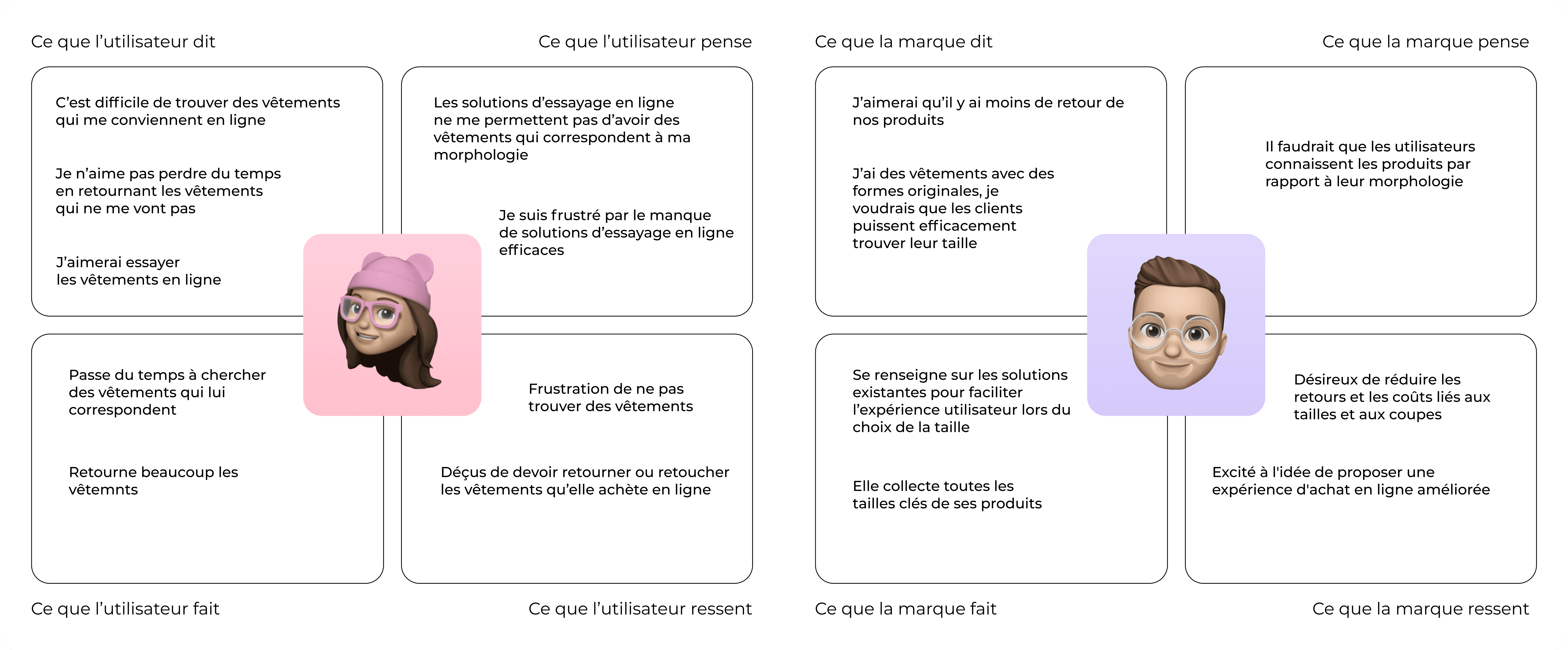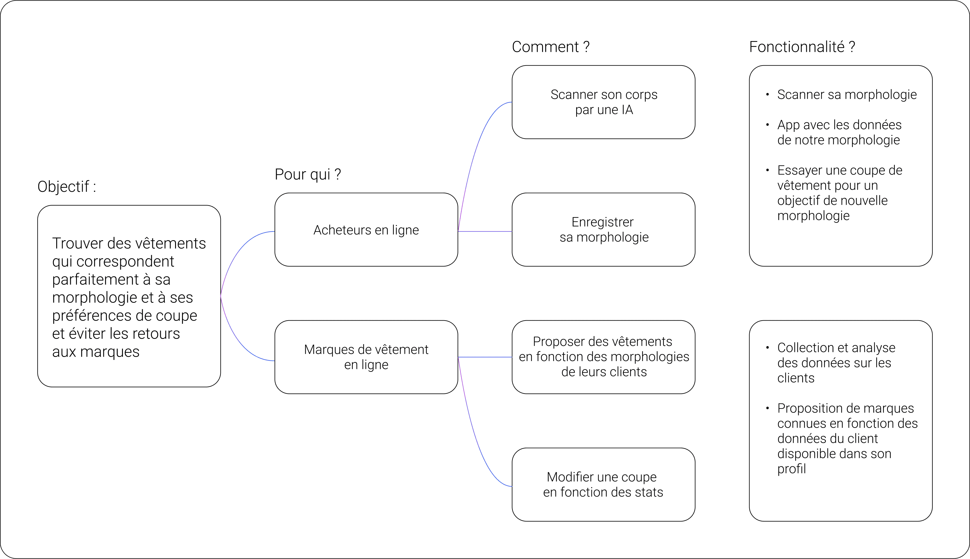 Pour qui ? : Les acteurs principaux identifiés sont les acheteurs en ligne et les marques de vêtements en ligne. Ces deux groupes bénéficieront d'une meilleure expérience d'achat et d'une réduction des coûts liés aux retours.