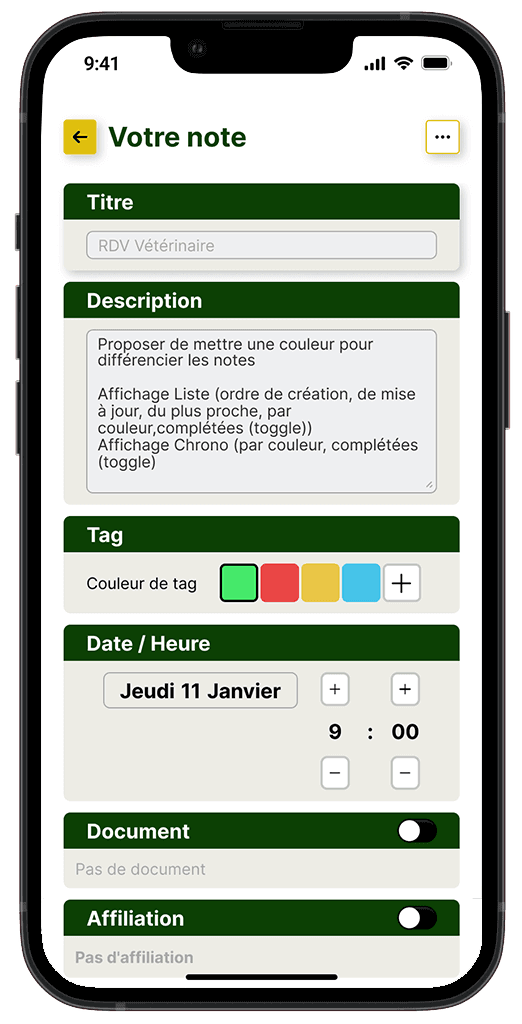 Il peut également ajouter une date avec une plage horaire, joindre des documents et associer la note à une personne ou à un lieu.