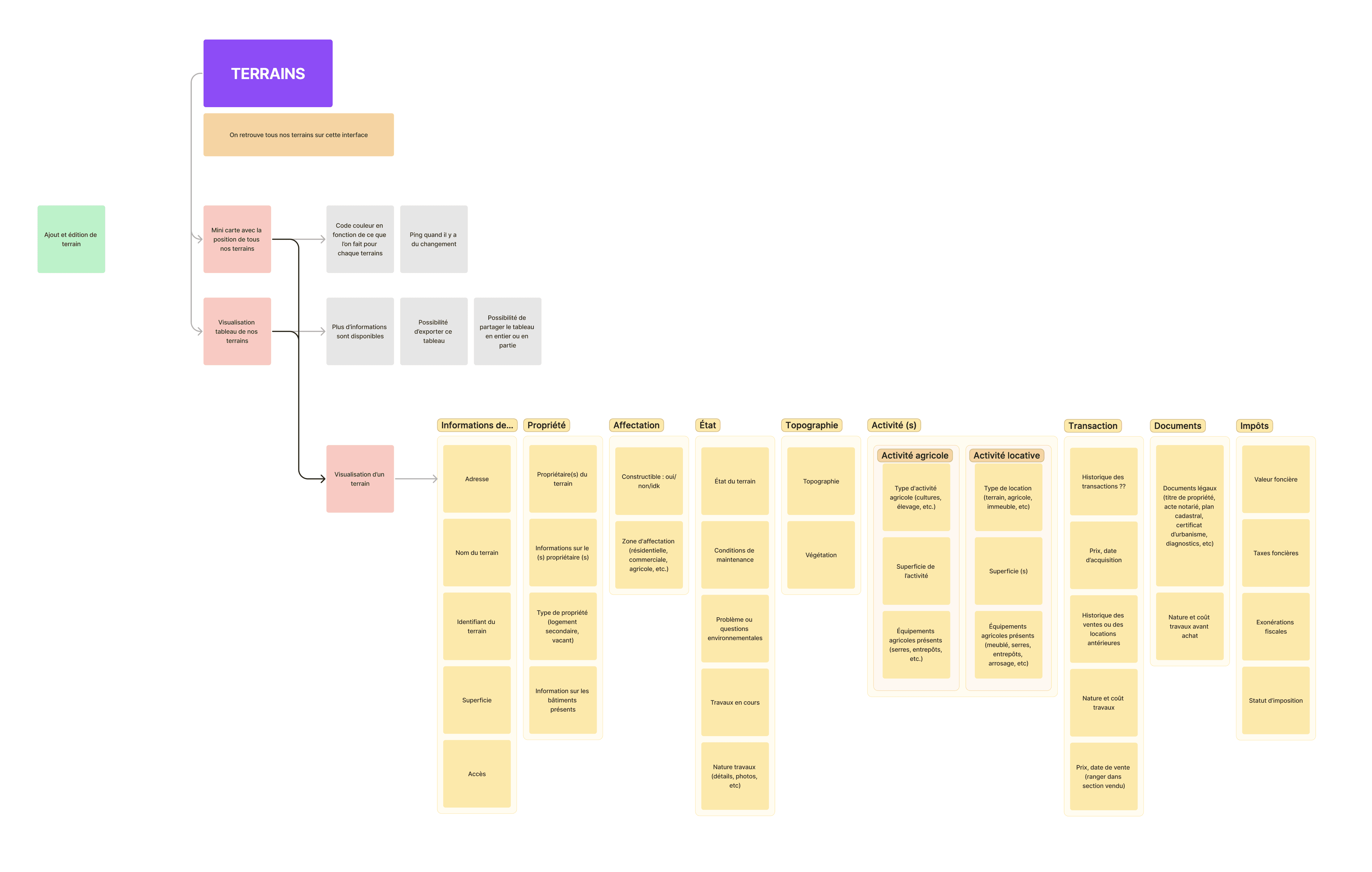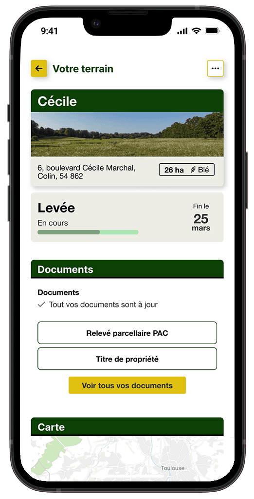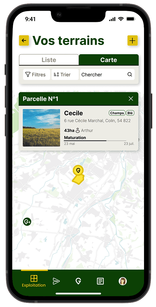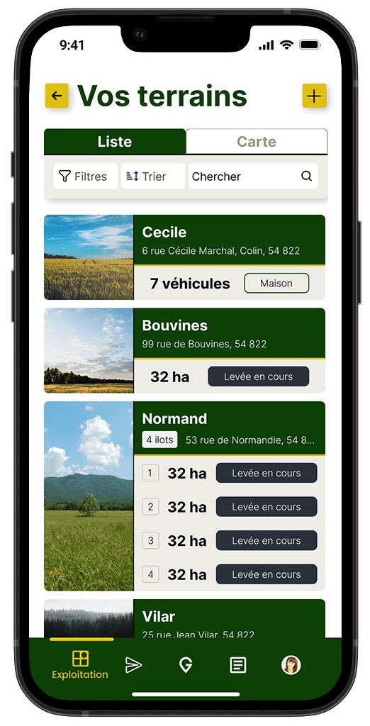 La section "Vos terrains" a pour but de rentrer plus en détail sur les terrains. Nous retrouvons le même type d'affichage, à savoir l'affichage par liste et par carte.