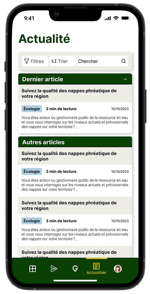 Nous disposons également d'une section qui offre un accès à l'espace messagerie de l'application, ainsi qu'une autre qui permet de consulter les derniers articles publiés.