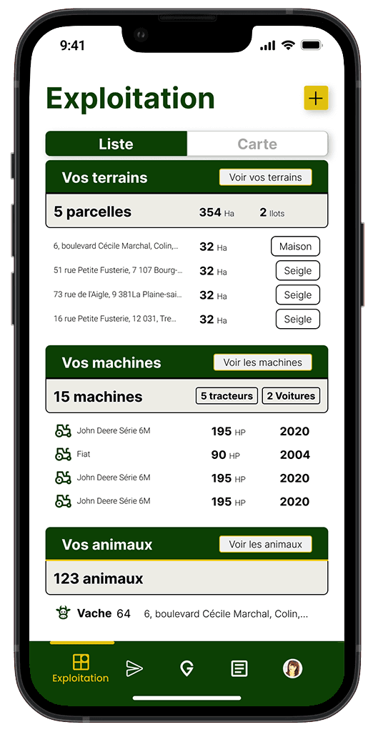 La section "Exploitation" permet de visualiser tous les biens que nous possédons, notamment les terrains, les machines et les animaux.