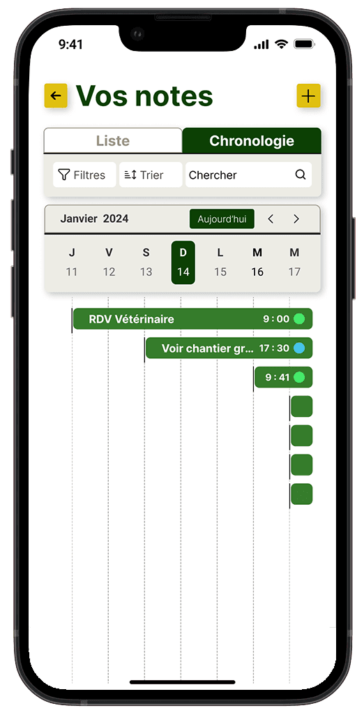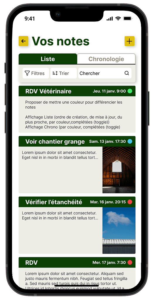 Cette section propose deux types d'affichage : l'affichage en liste et l'affichage en chronologie. L'affichage en liste permet de visualiser rapidement les données textuelles et les documents liés à chaque note. L'affichage en chronologie permet de visualiser les notes les unes par rapport aux autres en fonction de leur chronologie.