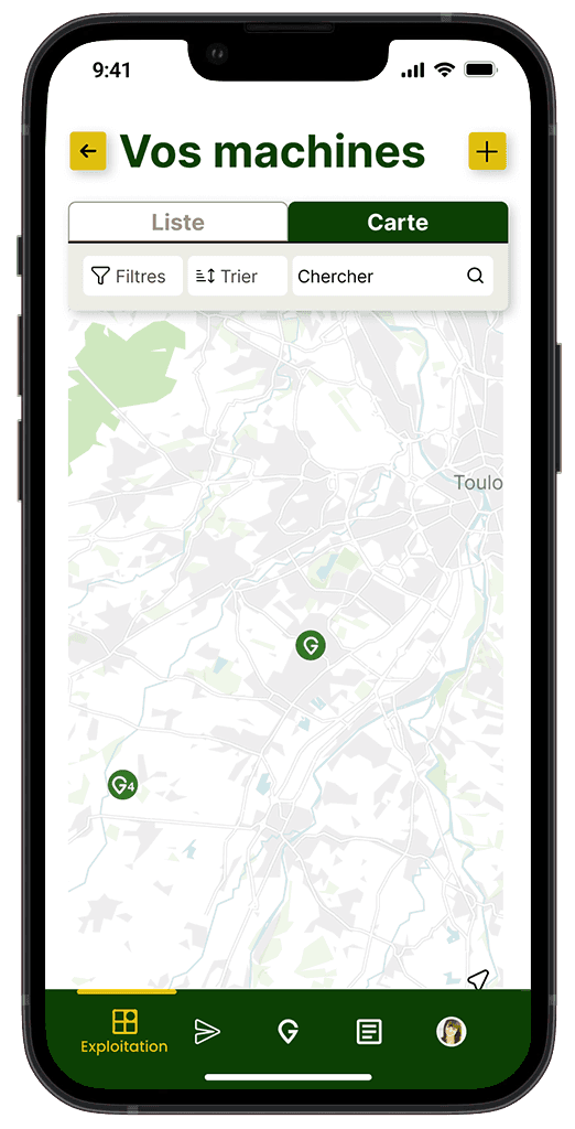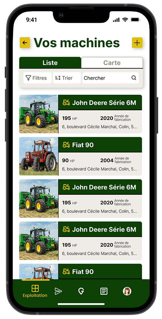 Cette section permet de visualiser en détail les machines que nous possédons. Nous avons une photo de la machine, son nom, la quantité de chevaux, l'année de fabrication, le lieu où elle est garée et le nom du collaborateur qui l'utilise.