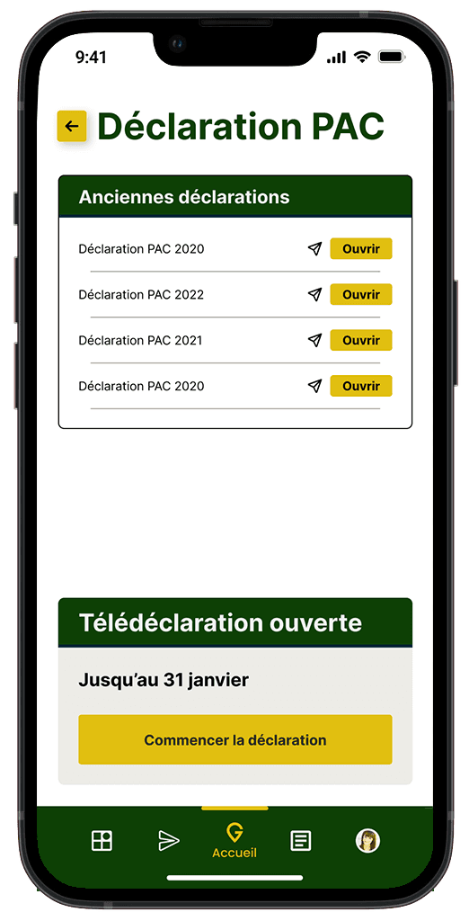 Sur cette interface, nous trouvons une section permettant de lancer la déclaration PAC, sur laquelle nous reviendrons ultérieurement.