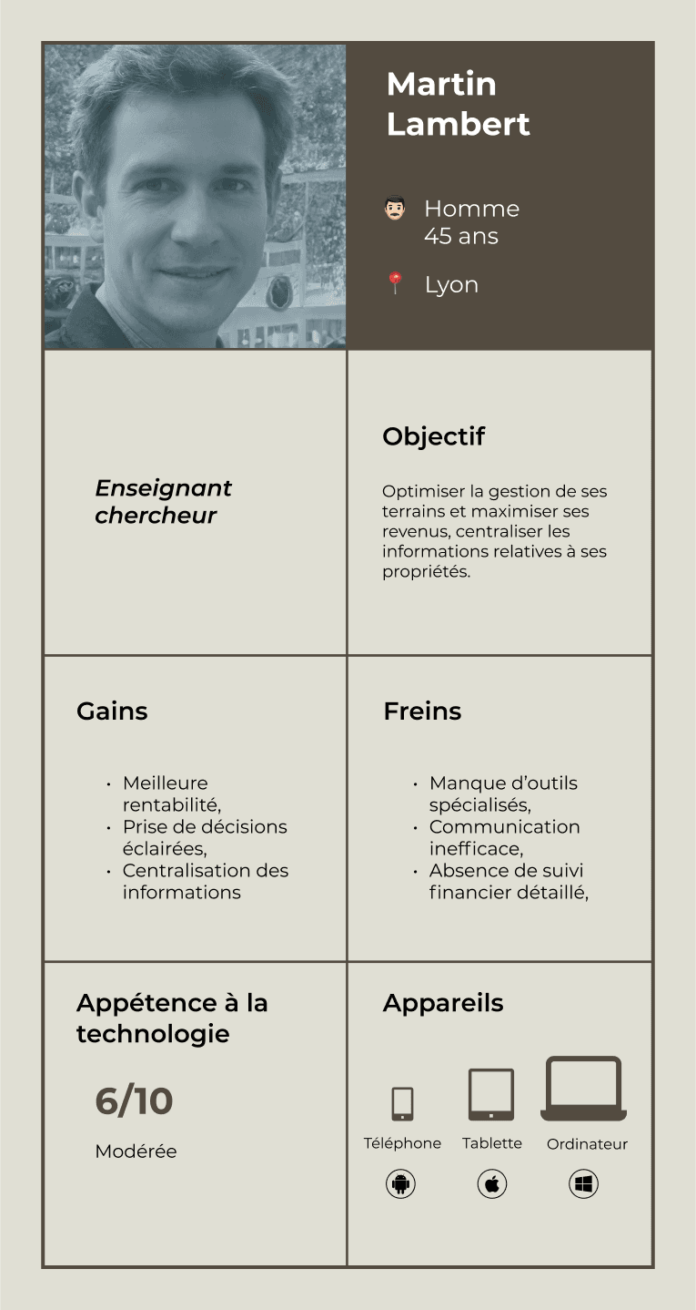 Martin Lambert, lui, représente les propriétaires de terrains, qu'ils soient agricoles, immobiliers ou autres. Ce profil a été identifié comme cible secondaire.